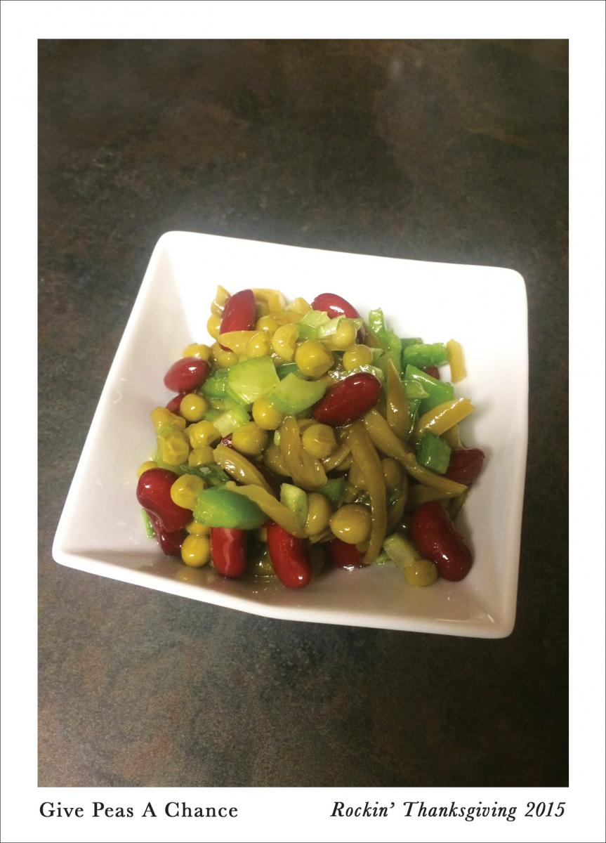 In bowl, combine beans, peas, celery, green pepper and onions. In separate bowl mix vinegar, oil and sugar. Pour over vegetables and stir. Cover and chill at least 24 hours.
